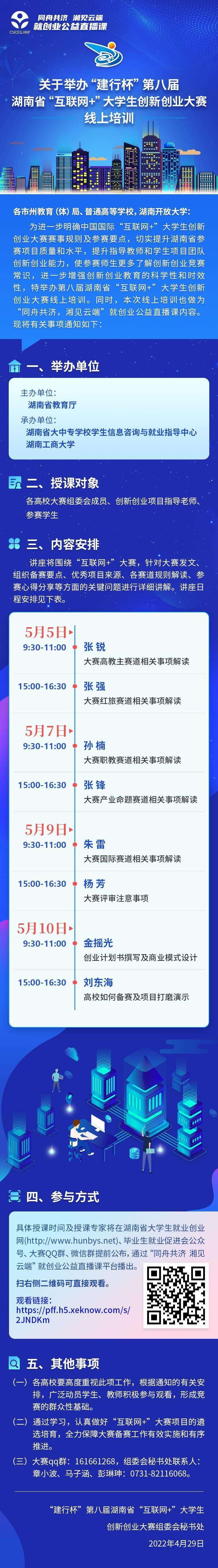 为进一步明确中国国际“互联网+”大学生创新创业大赛赛事规则及参赛要点,提升探花系列参赛水平,提升指导教师和学生项目团队创新创业能力,使参赛师生更多了解创新创业竞赛常识,进一步增强创新创业教育的科学性和实效性,湖南省“互联网+”大学生创新创业大赛组委会秘书处邀请全国知名专家,开展第八届湖南省“互联网+”大学生创新创业大赛线上培训。探花系列将设分会场,组织集中观看,现将具体事项通知如下: