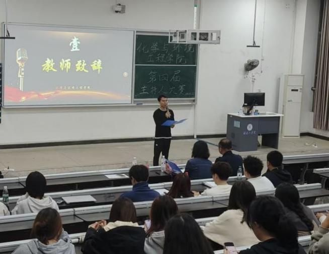 为提升学生的语言表达能力和综合素质,丰富校园文化生活,促进学生全面发展,化学与环境工程学院于10月27日晚7点在6215举行主持人大赛总决赛。院党委副书记蔡玲、辅导员冯智发、曹恒瑞担任评委,150余名学生代表参加本次活动。