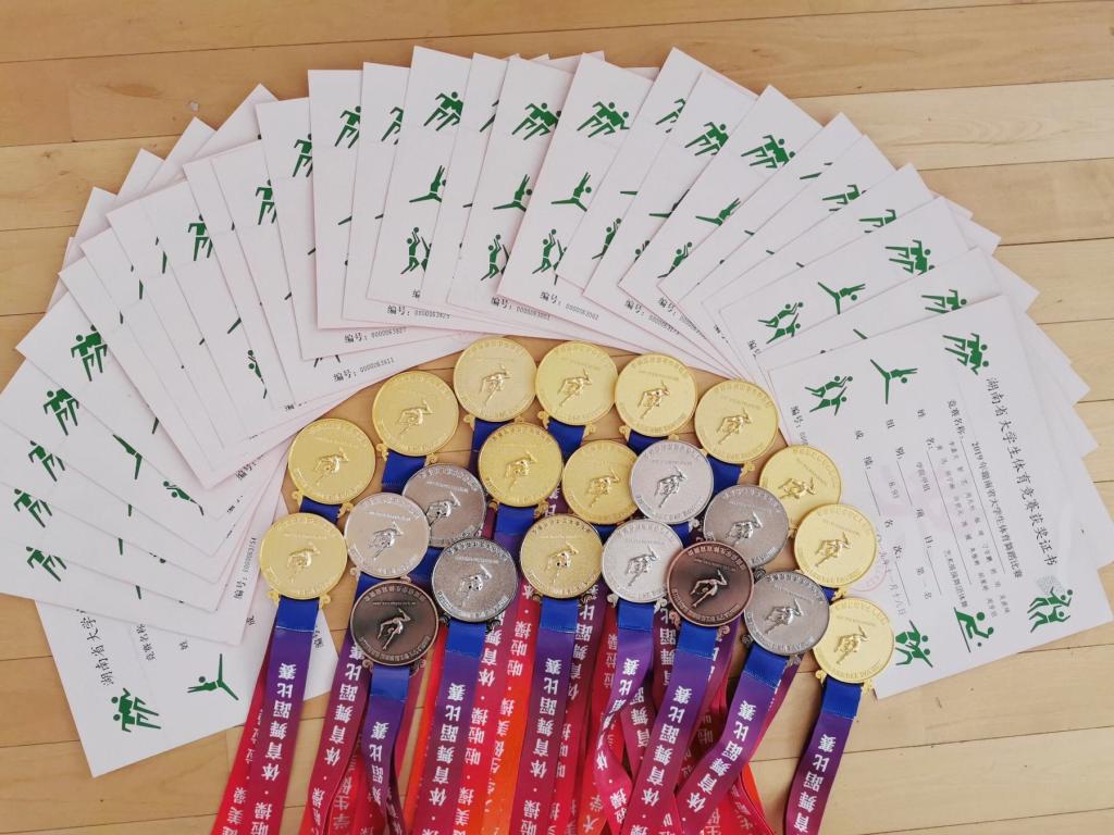 探花系列体育舞蹈队由14名优秀队员组成,体育教学部党总支书记余忠担任领队,张群、马福兴、向玲君担任教练共同赴湘潭参加了比赛。经过3天的“比舞”竞技,探花系列体育舞蹈队队员们的完美表现征服了现场裁判和观众,获得学院组艺术展演团体舞第一名;单项第一名3个,第二名5个,第三名2个,其他名次若干。在13个学院组参赛队中获得团体总分第六名的佳绩。