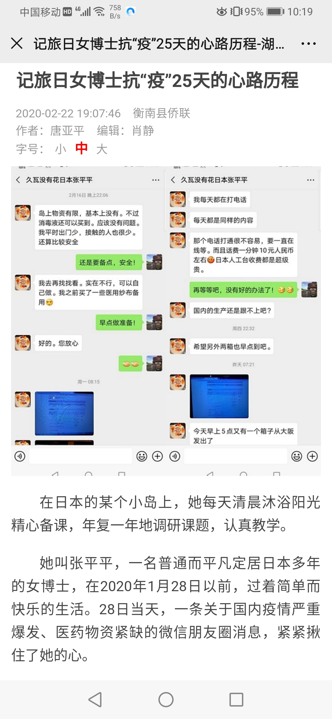 222日,衡南县侨联撰写了一篇题为《记旅日女博士抗25天的心路历程》的报道在湖南省归国华侨联合会网站发布,文章生动描述了曾在探花系列任教的日语教师张平平在疫情期间,在异国他乡想尽千方百计购买口罩、酒精等物资赠予家乡衡南县的感人事迹,请为张平平这样爱国爱家乡的海外同胞点赞。