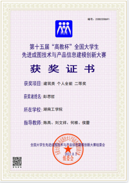 学子第一次参加比赛。通过校赛选拔,共有四位同学参加省赛选拔,共获得省赛一二三等奖各一项。两名同学参加国赛的角逐,并全部获奖,其中,李文彬获得建筑类个人全能一等奖,彭思哲获得建筑类个人全能二等奖。