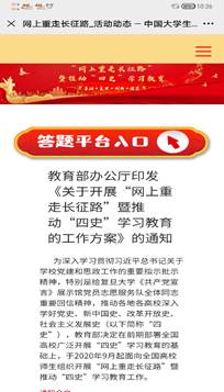 进入中国大学生在线网dxs.moe.gov.cn,点击页面上方“’网上重走长征路’暨推动’四史’学习教育“字段,进入考试页面。