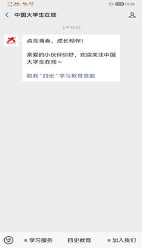 关注“中国大学生在线”微信公众号,点击菜单“四史教育”,进入竞答平台。