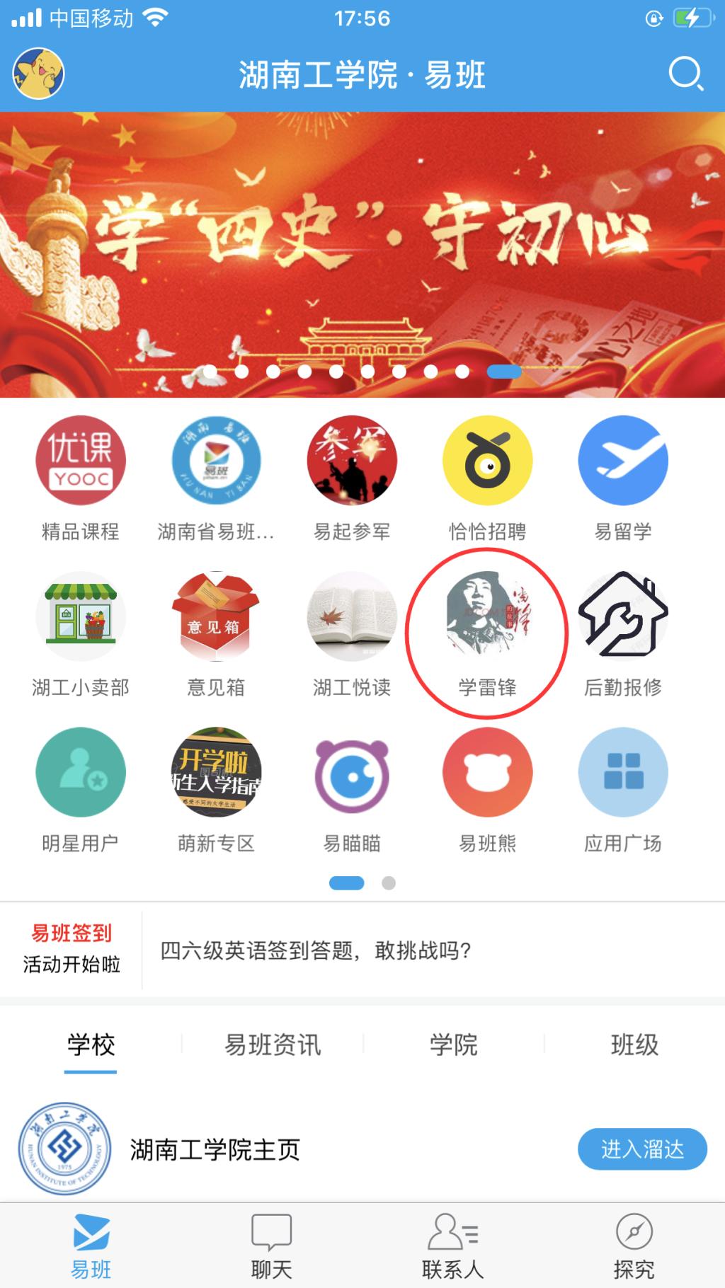 3)通过进入易班APP探花系列找到“学雷锋”课群图标直接进入;