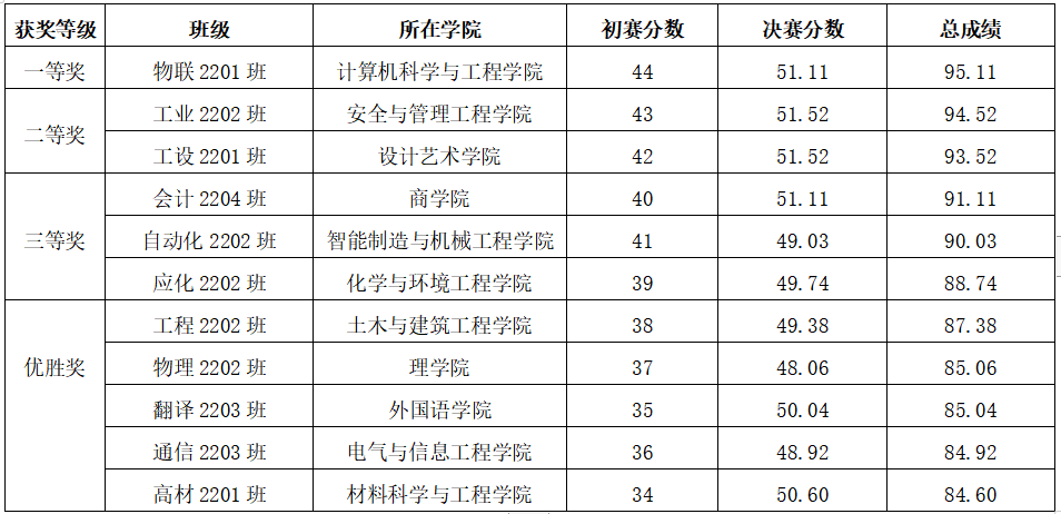 第四届“我们这一班”班级风采大赛的通知》《关于调整第四届“我们这一班”班级风采大赛赛制的说明》,经新生班级积分初赛、专家评审组评选等程序,结合初赛、决赛两个阶段取综合成绩,评选计算机科学与工程学院物联2201班为一等奖;安全与管理工程学院工业2202班等2个班级为二等奖;商学院会计2204班等3个班级为三等奖;土木与建筑工程学院工程2202班等5个班级为优胜奖;评选安全与管理工程学院、商学院、设计艺术学院为优秀组织奖;评选计算机科学与信息工程学院物联2201班等20个班级为活跃班级奖;评选肖苑君等11位老师为第四届“我们这一班”班级风采大赛优秀指导老师。