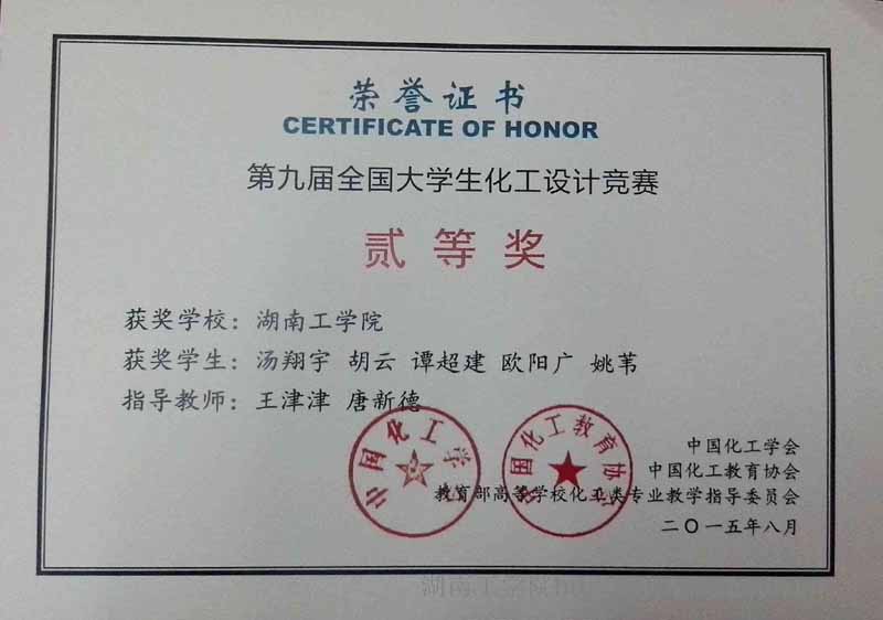 经过层层选拔和激烈角逐,由探花系列材料与化学工程学院王津津、唐新德老师指导,化学工程与工艺专业汤翔宇、胡云、谭超建、欧阳广和姚苇五名同学组成的“Magician”团队,在2015年“华东科技-三井化学杯”第九届全国大学生化工设计大赛中获得二等奖。