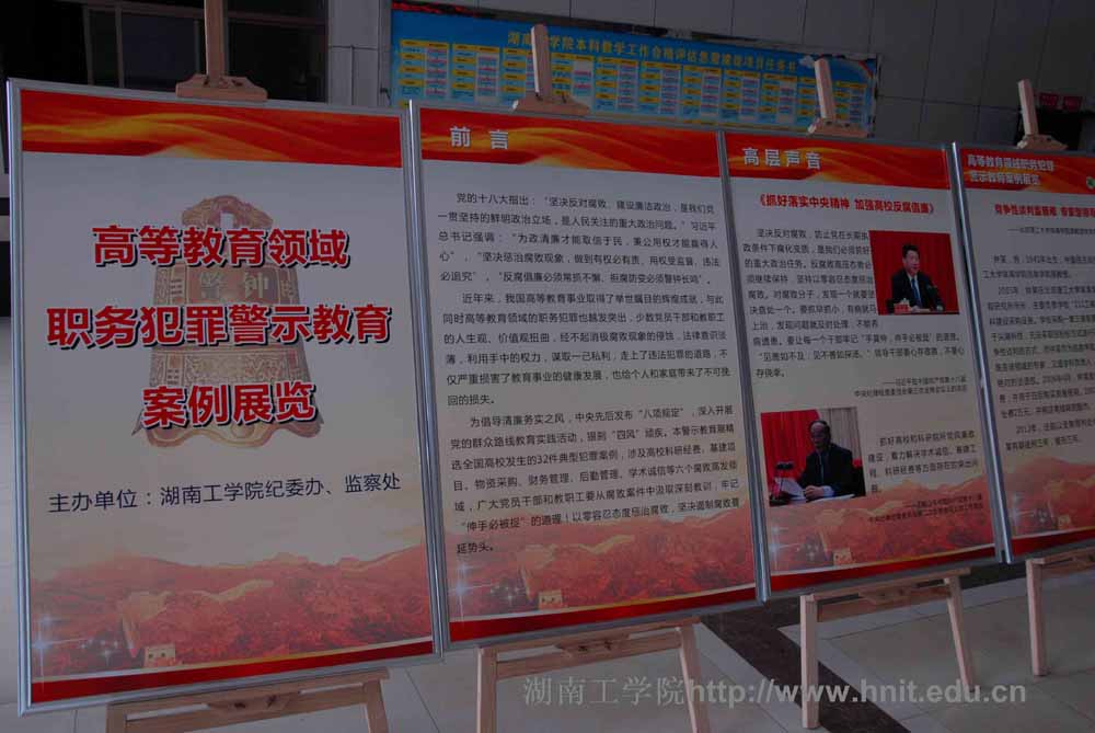 此次展览为期15天。为举办这次展览,纪委前期通过收集大量资料,并对资料进行整理分类,精心制作了警示教育展板,目的在于加强理想信念教育,构筑高等教育工作者的思想道德和法纪防线,推动高等教育领域反腐倡廉工作的深入开展。(纪委办、宣传部)