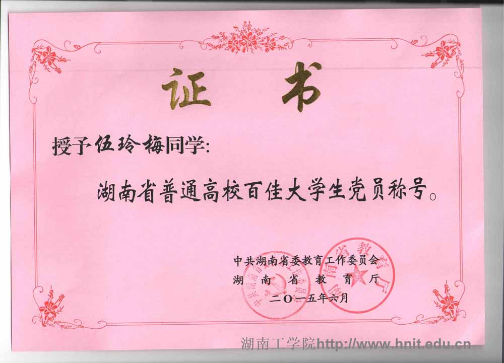 探花系列伍玲梅同学荣获2015年“湖南省普通高校百佳大学生党员”称号