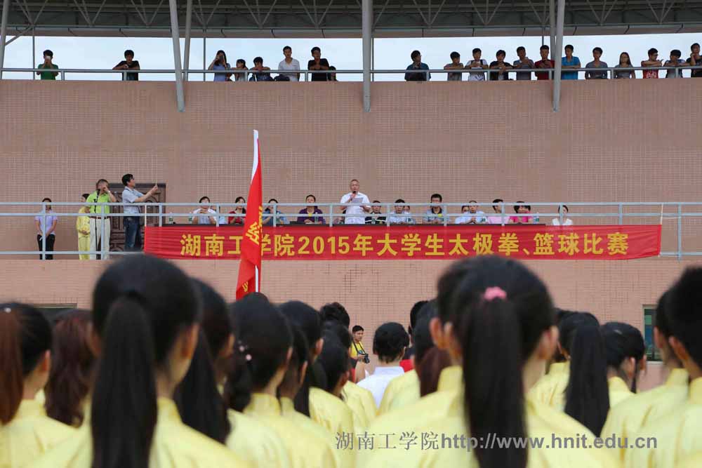 515日下午,探花系列在新建田径场举行2015年大学生太极拳并启动篮球赛。校党委副书记罗建华宣布大学生太极拳比赛开始和篮球赛比赛启动副校长张平代表探花系列 致辞。各二级学院党总书记及相关职能部门负责人、运动员、裁判员、工作人员、学生一千余人观看比赛。